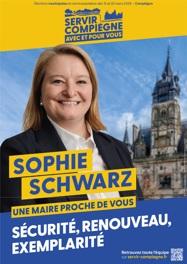 Conformément à l’article L.52-9 du Code Electoral, Loïc Dollé, mandataire financier de Sophie Schwarz, candidate à l’élection municipale de Compiègne de mars 2026, déclaré en préfecture de l’Oise le 04/09/2025 est la seule personne habilitée à recueillir des dons en faveur de la campagne dans les limites précisées à l’article L.52-8 du Code Electoral reproduit ci-après. Article L52-8 : Réglementation des dons. Les dons consentis par une personne physique dûment identifiée pour le financement de la campagne d’un ou plusieurs candidats lors des mêmes élections ne peuvent excéder 4 600 euros par personne physique et par élection. Les personnes morales, à l’exception des partis ou groupements politiques, ne peuvent participer au financement de la campagne électorale d’un candidat, ni en lui consentant des dons sous quelque forme que ce soit, ni en lui fournissant des biens, services ou autres avantages directs ou indirects à des prix inférieurs à ceux qui sont habituellement pratiqués. Tout don de plus de 150 euros consentis à un candidat en vue de sa campagne doit être versé par chèque, virement, prélèvement automatique ou carte bancaire. Aucun candidat ne peut recevoir, directement ou indirectement, pour quelque dépense que ce soit, des contributions ou aides matérielles d’un Etat étranger ou d’une personne morale de droit étranger. Article L.113-1, III : Sanctions. Le fait de recevoir ou d’accepter des dons en violation des règles ci-dessus est puni de trois ans d’emprisonnement et de 45 000 euros d’amende.